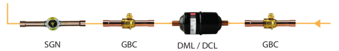 必須選擇與制冷系統(tǒng)的連接方式和容量相符的干燥過濾器。如果需要焊接連接方式的干燥過濾器,則 Danfoss DCL/DML 型干燥過濾器可以滿足要求。它具有極高的干燥容量,從而延長了兩次更換間的時(shí)間間隔。接頭A 上的軸環(huán)表明接頭尺寸單位為毫米。如 果接頭A 是平的,即沒有軸環(huán),則表明接頭的尺寸單位為英寸。DML 型、DCL型可適用于可適用于R134a R404A R507 R22 R407C R410A R290 R32 制冷劑。