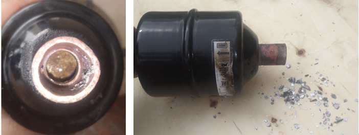系統(tǒng)維修更換了壓縮機(jī),更換了新干燥過濾器,短時(shí)間試運(yùn)行后,再從系統(tǒng)拆下來的過濾器,傾倒出的金屬雜質(zhì)。下列兩張圖片顯示,干燥過濾器有效地起到阻隔雜質(zhì)異物的保護(hù)作用,避免節(jié)流裝置臟堵以及金屬雜質(zhì)回流到壓縮機(jī),可能產(chǎn)生的故障。